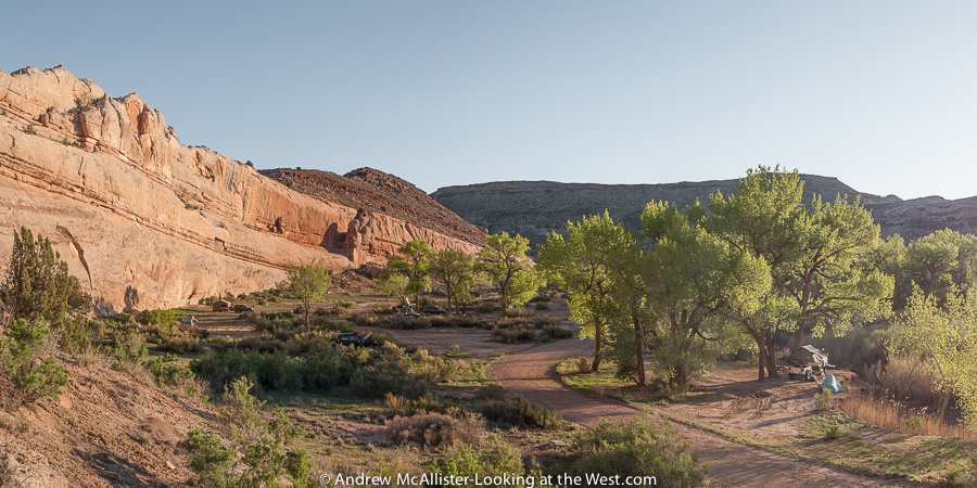Close to the trails end our group passed through a gate with a nice view of the Colorado River and the crossing at Dewey. There are two bridges at Dewey. The original wood plank bridge burned in 2008 and there is a local effort to restore it. Our group would meet up at the old bridge foundation and then head to our campsite near the Delores River where we would have lunch and drop trailers before heading to the Top of the World trail. Note the tilted angle of the earth’s crust. Below: sandstone cliffs and domes near Utah Scenic 128.